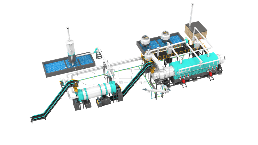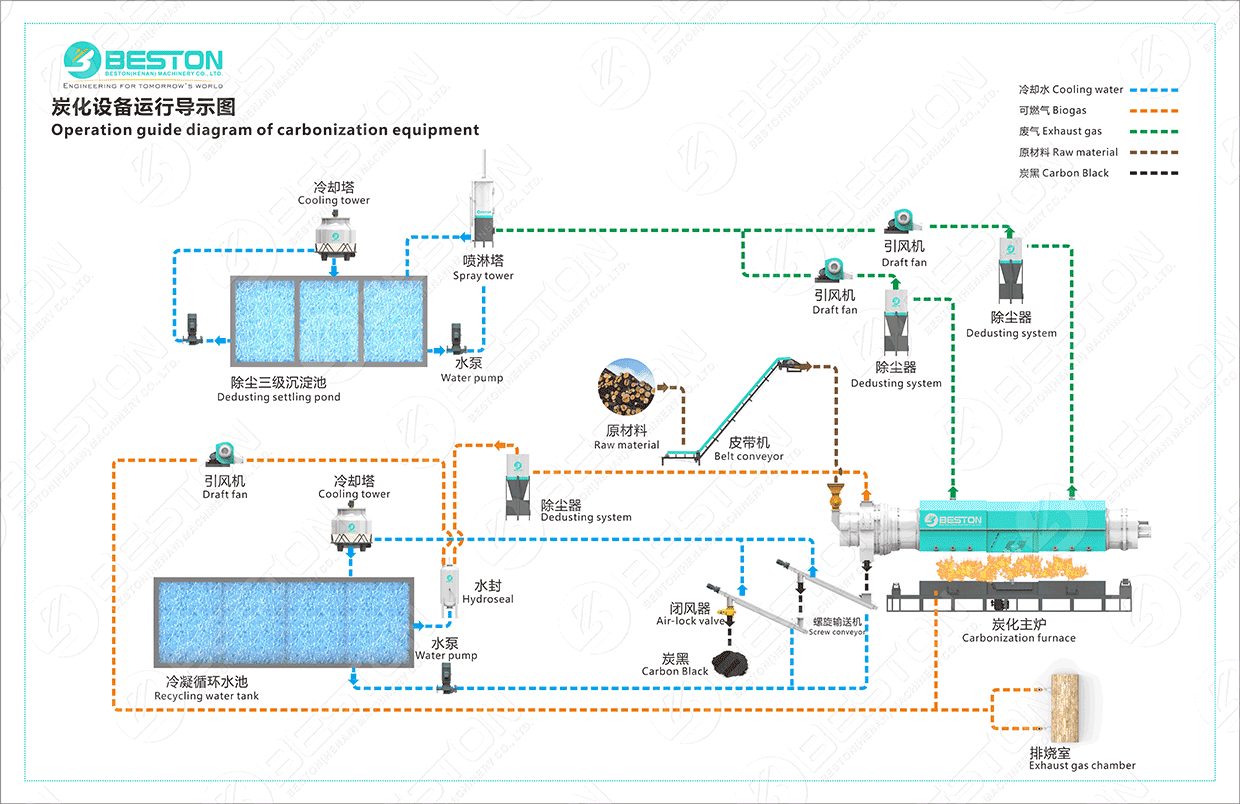 污泥碳化由烘干爐(非必選)、炭化主爐、冷凝器(非必選)、冷卻塔等部分組成; 炭化主爐由主滾筒、機(jī)殼、燃燒室等部件組成