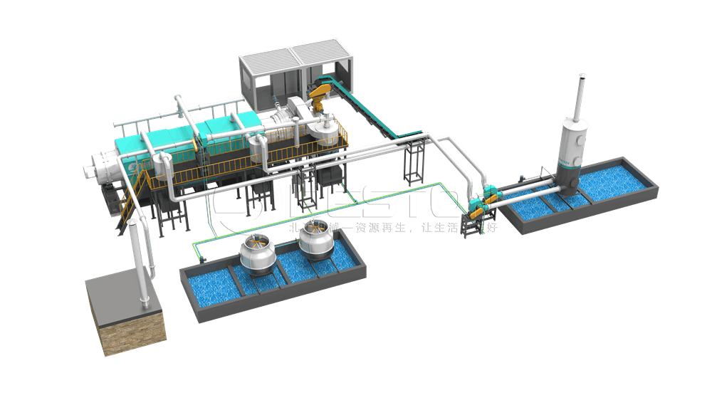 稻殼碳化設備由烘干爐(非必選)、炭化主爐、冷凝器(非必選)、冷卻塔等部分組成; 炭化主爐由主滾筒、機殼、燃燒室等部件組成